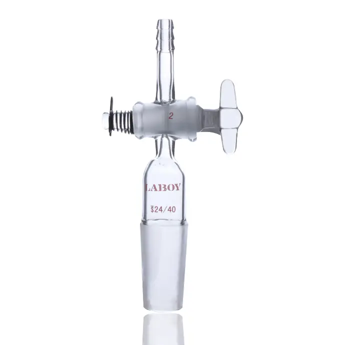 The flow-control glass adapter with PTFE or Glass stopcock is used to regulate the flow of gases or liquids into reaction systems.Stopcock has a bore of 2mm.